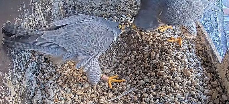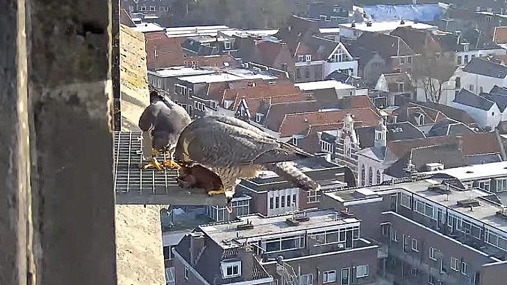Nog wat later zien we op het rooster een zichtbare prooioverdracht. Pa doet dus goed zijn best voor haar, waarschijnlijk hopend op een vroeg broedseizoen. We moeten echter nog wachten tot de tweede week van maart, als meestal het eerste ei gelegd wordt.